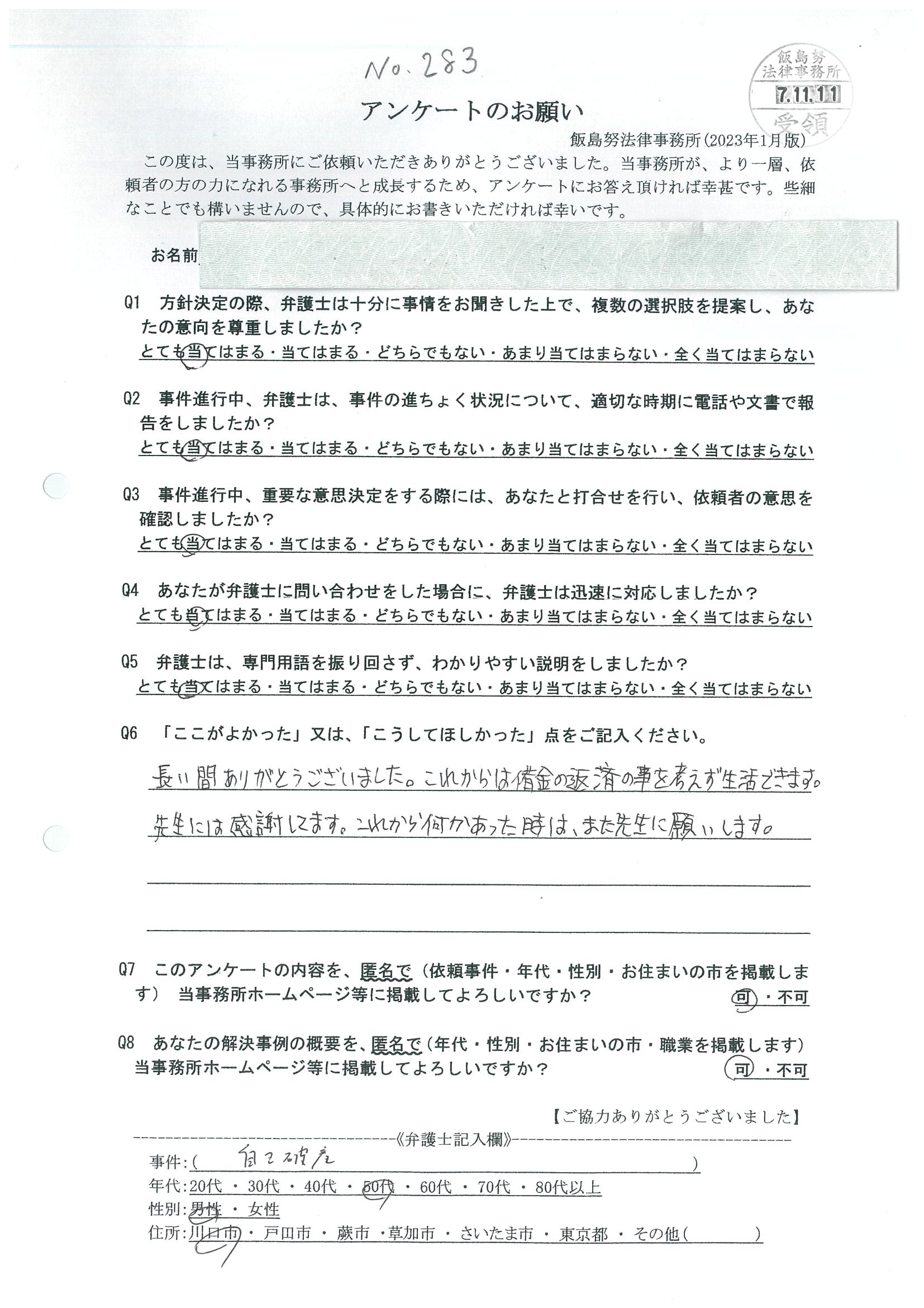 「長い間ありがとうございました。これからは借金の返済の事を考えず生活できます。先生には感謝してます。これから何かあった時は、また先生にお願いします。」(2025年11月11日)